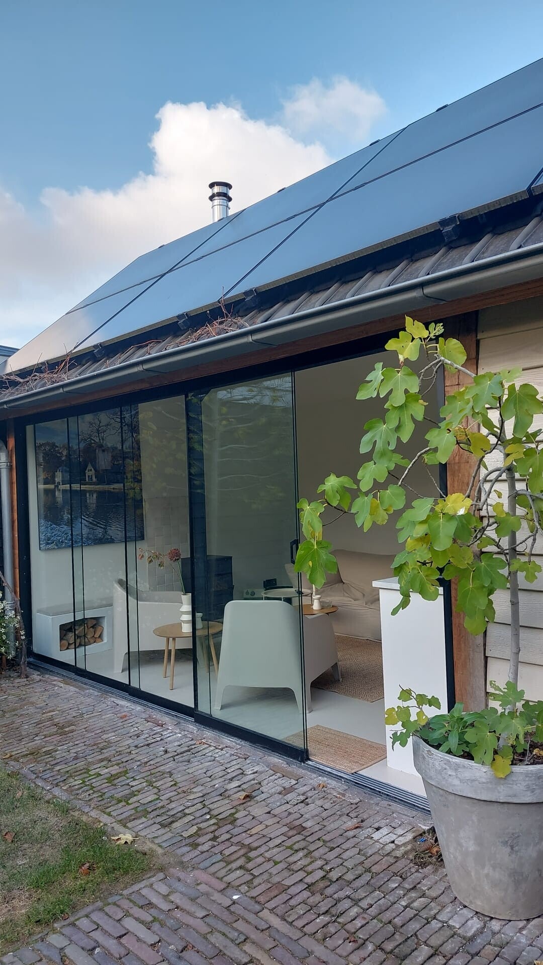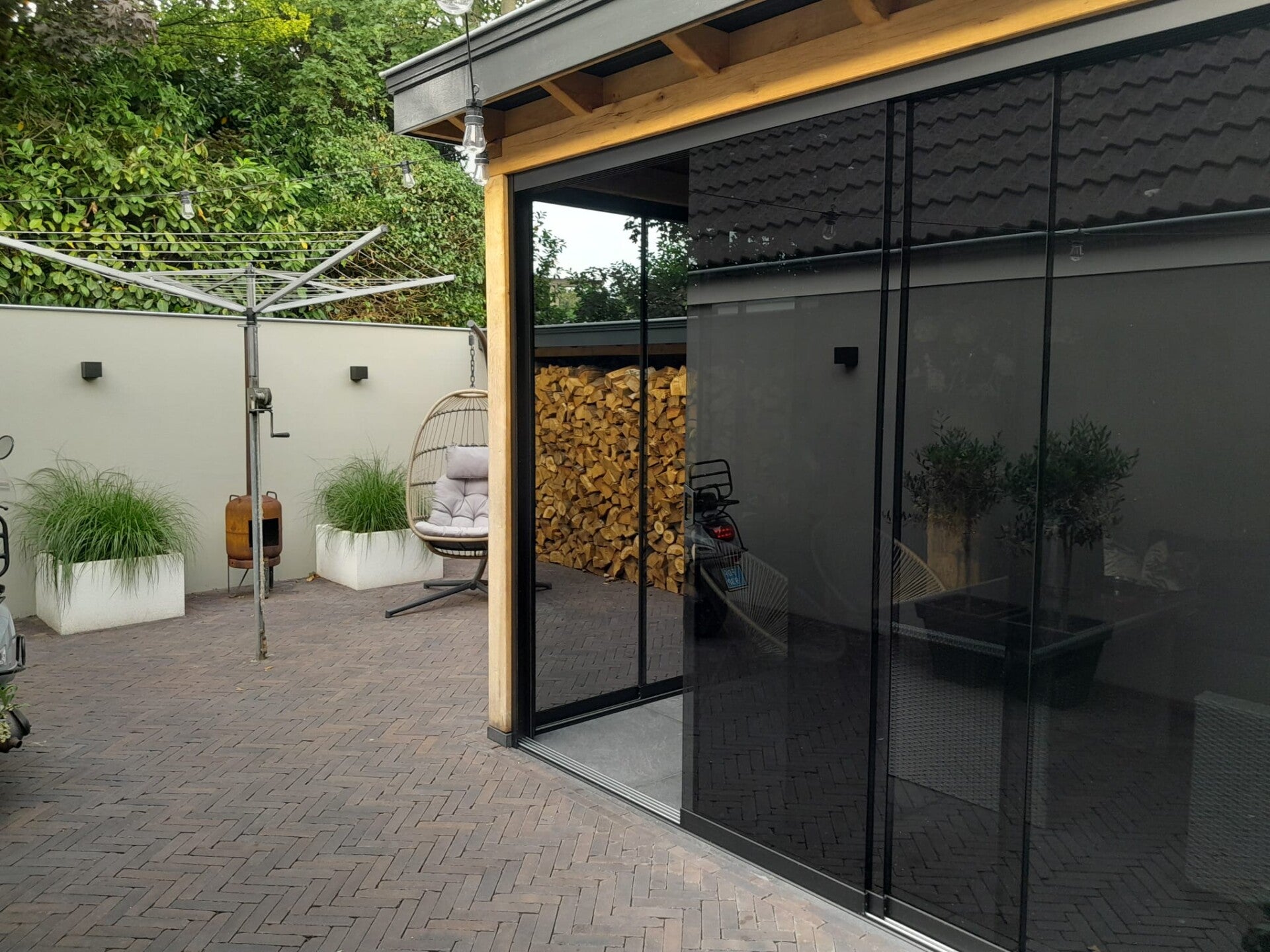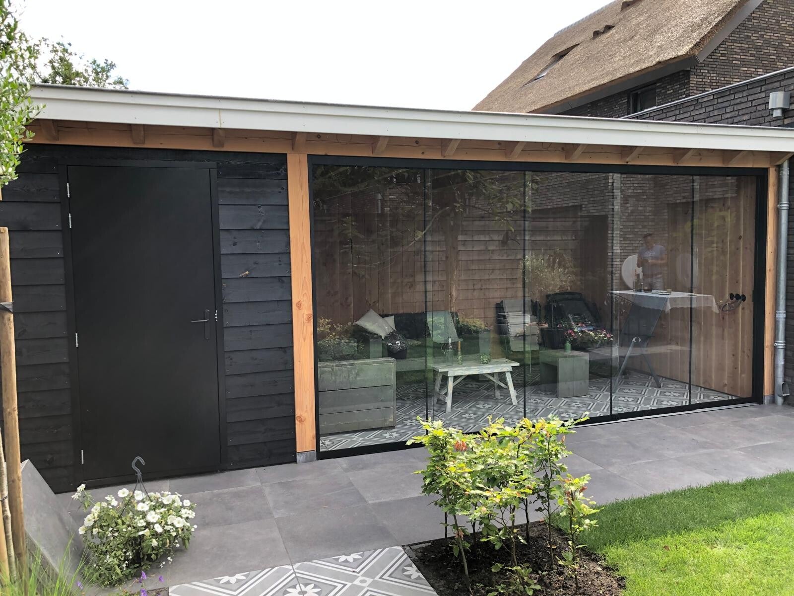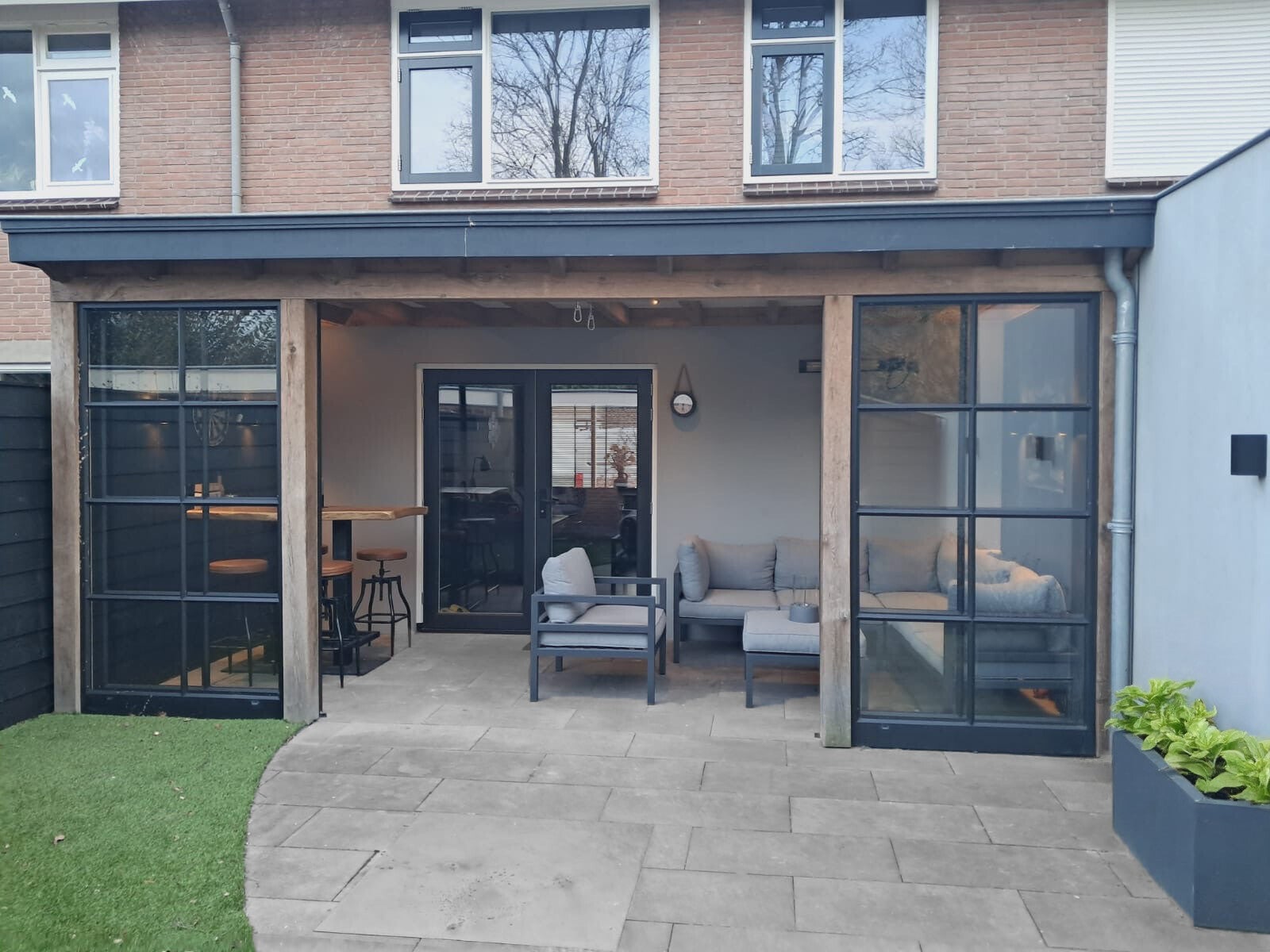 Wilt u een mooie en praktische uitbreiding van uw woning? Deze houten tuinkamer met stalendeuren en een glaspui geniet u van extra ruimte en veel natuurlijk licht.
